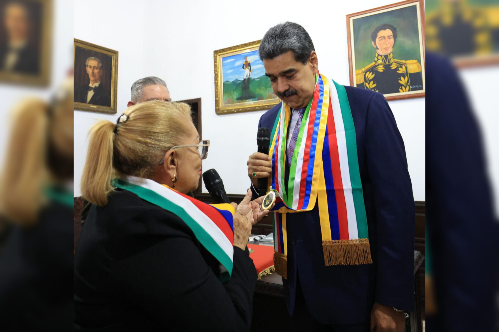 En un acto de profundo significado, al presidente Maduro le fue impuesta la estola que lo acredita como Presidente Honorario de la Sociedad Bolivariana de Venezuela. Asimismo, fue condecorado con una distinción que lo reconoce como “Constructor de la Paz”, en virtud de su dedicado compromiso por cumplir con el objetivo primordial de difundir, promover e impartir los pensamientos, ideas y la obra emancipadora del Libertador de América, Simón Bolívar, entre todos los ciudadanos y ciudadanas.
