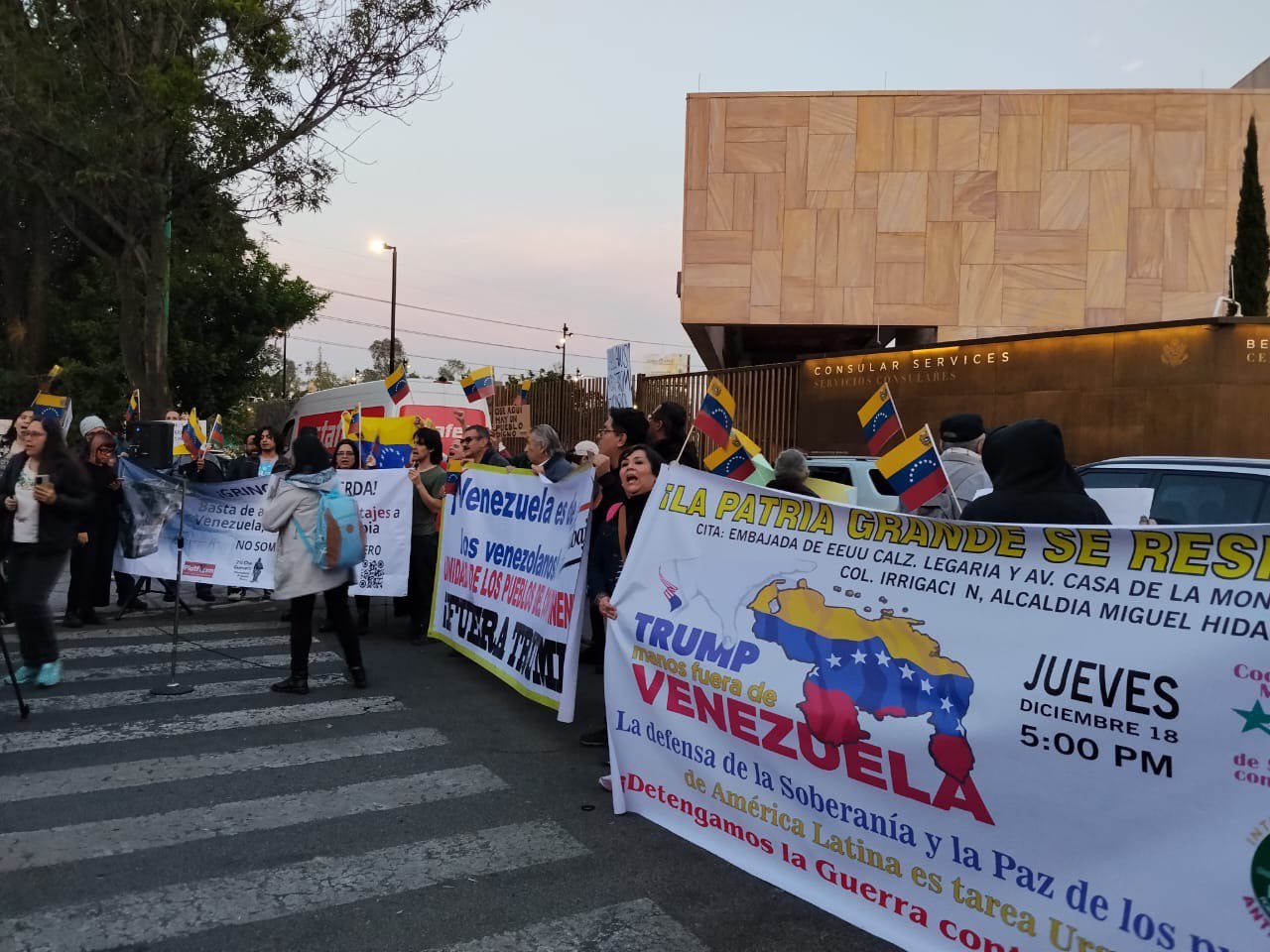Bajo la consigna «Venezuela no se vende», decenas de manifestantes se congregaron frente a la nueva sede de la Embajada de Estados Unidos en la capital mexicana.